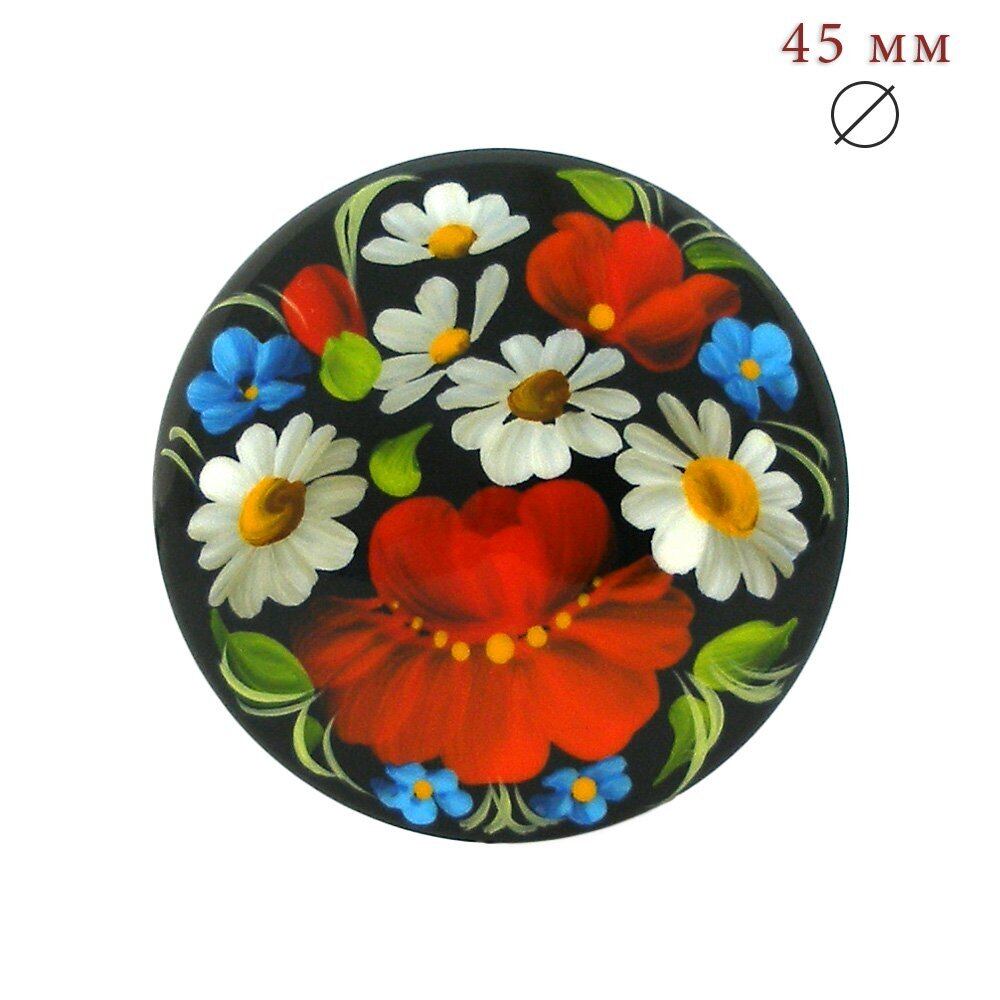 ウクライナの伝統工芸ペトリキウカ塗りを使用したハンドメイドのブローチです。カラフルな色合いの花々がハンドメイドで施されており、装飾としての魅力を引き立てます。さりげないデザインは、カジュアルなスタイルからフォーマルな装いまで幅広く活躍します。サイズは直径45mmで、存在感があり、洋服を美しく飾ります。